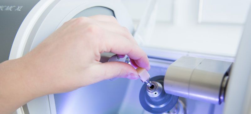 Im Anschluss an die Planung schicken wir die Daten drahtlos an die CAD-CAM-Fräse unseres CEREC-Systems. Diese fertigt aus einem farblich passenden Keramikblock in nur ca. 15 Minuten und auf wenige Mikrometer genau den gewünschten Zahnersatz.