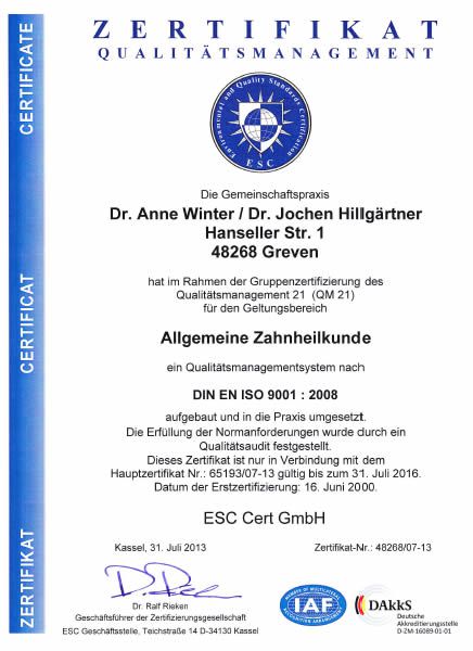 Bereits vor einigen Jahren stellten wir uns die Frage, wie man möglichst objektiv und für den Patienten nachprüfbar ein Qualitätssicherungssystem für Zahnarztpraxen etablieren kann. Das Ergebnis dieser Bemühungen stellt die ISO-Zertifizierung nach der internationalen Norm DIN EN ISO 9001 dar.Ursprünglich war die ISO-Zertifizierung für industrielle Großbetriebe entwickelt worden und wurde nun auch auf den zahnmedizinischen Sektor übertragen. Mehr Erfahren >>